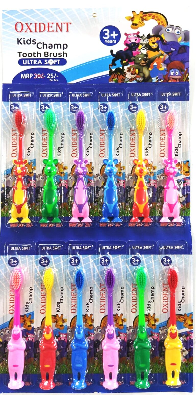 The Oxident KidsChamp Tooth Brush is specially designed for children aged 3 and above. With ultra-soft bristles, it gently cleans young teeth and protects delicate gums. Its fun, colorful animal handles make brushing exciting and playful. At just ₹25, it combines safety, comfort, and fun—making dental care a happy habit!
